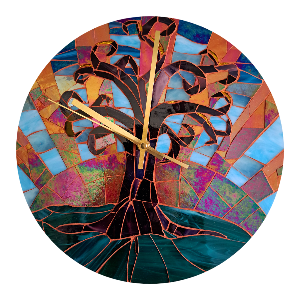 The Sunrise Clock is made from sheets of stained glass and a painted wooden tree. The silent mechanism moves the hands gently around the face. With the changing light of the day the reflections from the irridescent surfaces play and interact with the light, creating changing perspectives.
